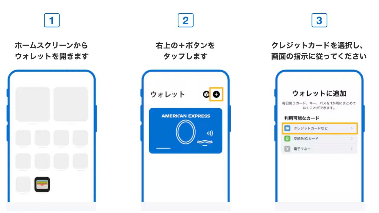 Apple Payでは、対応している法人カードを「ウォレット」アプリに登録することで非接触決済が可能になります。ここでは、ウォレットアプリを使った登録手順とエクスプレスモードの設定方法をそれぞれご紹介します。